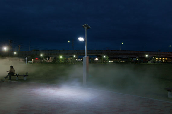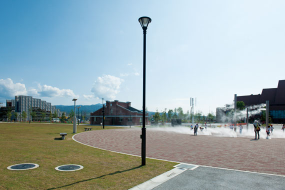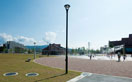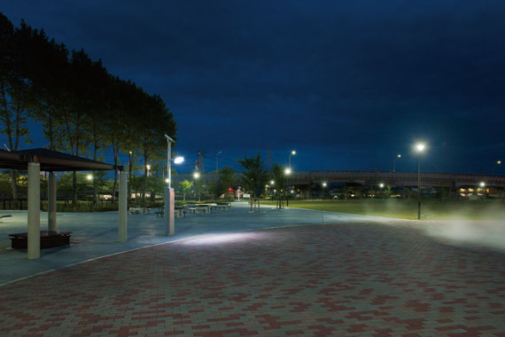 公園内の園路照明については、省エネ・省メンテナンスに貢献するLED街路灯レディオック エリア テクノレイが採用されました。水銀ランプ200W用街路灯と同等の明るさをLED3W×16で実現する(レディオック エリア テクノ レイ)は、電力量・CO₂排出量を大幅に削減し、省エネ、環境保全に貢献しながら夜間の公園を安全・快適に照らし出しています。また、太陽光の発電エネルギーをバッテリーに蓄え夜間照明を点灯するLED光源の太陽灯も園内に設置し、万一の災害時や停電時には安全・安心を担う照明としての役割を持たせています。
