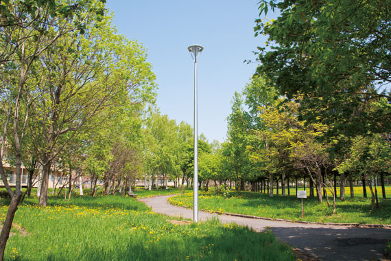 Myリストに追加札幌市手稲区に位置する前田公園は、住宅団地造成に伴い整備された施設で、札幌市の道道石狩手稲線に面した手稲前田地域の中心に位置する閑静な公園です。敷地面積は38,790m²で、筑山やパーゴラ、藤棚、芝生広場や遊戯施設が設置され、地元の方々の憩いの場となっています。また、野球場やテニスコート、スキー山など充実したスポーツ施設もあり、年間を通じてさまざまなスポーツが楽しめる公園として広く親しまれています。園内を照らす照明器具の老朽化に伴い、札幌市では、照度アップ及び省エネを図るため改修工事を行い、新たにLED街路灯が設置されました。水銀ランプ400W相当の明るさを達成したLED街路灯レディオック エリア タイプGへと更新することで、既設水銀ランプ300Wと比べ明るさを向上させるとともに大幅な省エネを実現。