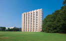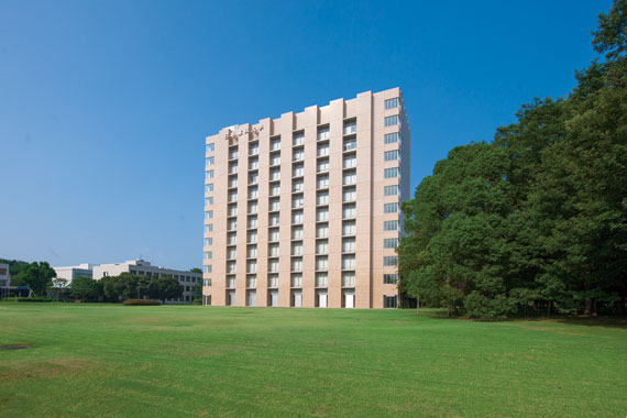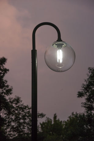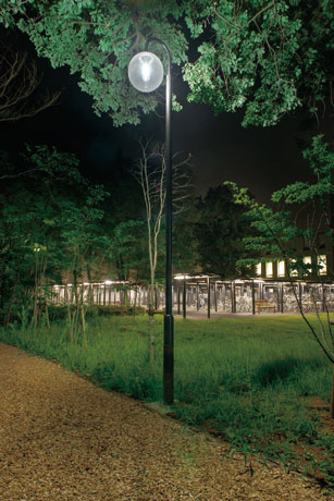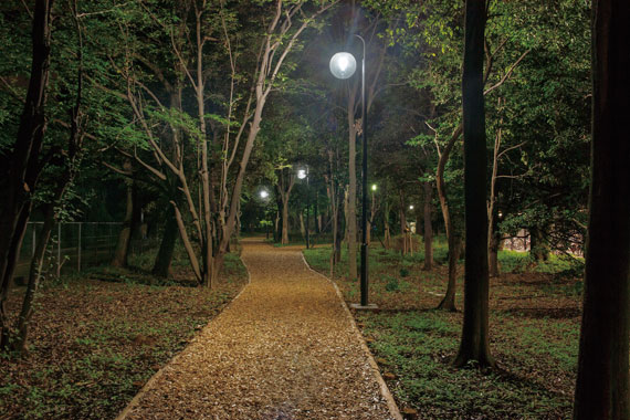 樹木に囲まれ、自然を感じながら走ることができるクロスカントリーコースは全長約2Km(往復)で、良質なウッドチップ舗装のコースです。照明設備については、コースに沿ってレディオック LEDライトバルブを光源とするポールライトを配し、省電力に貢献する光で、夜間も良好な視環境をつくりました。クリアグローブのポールライトにHIDランプと同様の全周配光を実現した高効率LEDランプを組合せることで光の広がりを確保し、キャンパスに隣接する道路も明るくなったため、地域の方々には防犯効果があると好評をいただいております。