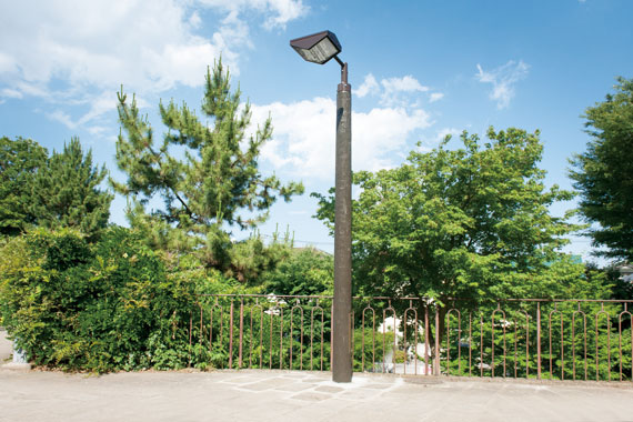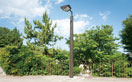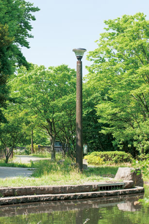 レディオック LEDライトバルブ 72Wを光源とし全方向配光タイプの照明柱と、前方横配光タイプのアーム型LED照明柱を場所に応じて配置し、良好な照明環境をつくり出しています。両タイプとも耐候性、腐食を考慮のうえ、コンクリート柱を使用し、杉の木肌を表現した擬木照明柱とすることで風景に馴染む景観になるよう留意しました。ジョギングや散策、犬の散歩など、近隣の方々の憩いの場として親しまれている緑道を、省エネに貢献するLEDの光で安全・快適に照らしています。