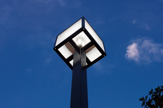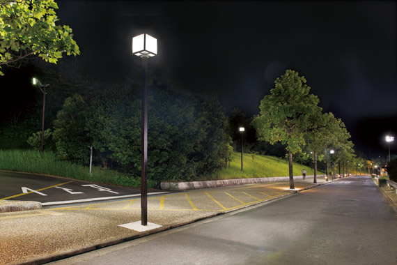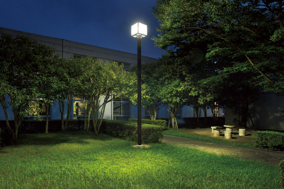 LED照明器具の選定にあたっては、既設の外灯デザインを継承しつつLED化することができるよう留意のうえ、既設外灯とほぼ同じデザインのポールライトと「レディオック LEDライトバルブ」を組合せて採用しました。「レディオック LEDライトバルブ」は器具一体型のLED照明器具と異なり、高出力であると同時に、ランプと安定器を交換するだけで更新が完了するため、10年後の更新の手間が少ない点にも着目し採用に至りました。道路に面した園路には水銀灯200W相当の72Wを、中庭には水銀灯300W相当の124Wを配灯するなど、場所に応じて適切な明るさの外灯を設置。今までと比較して明るく、特に駐車場の出入口が明るくなったため、警備上もより安全になったと好評です。
