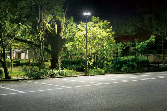 空間全体を明るく照らし発光効率に優れている全周発光タイプの「レディオック エリア タイプD」は、下側エリアのみ配光しているため、上空への光漏れを抑制し光害対策がなされています。ジョギングや散策、犬の散歩など、近隣の方々の憩いの場として親しまれている本公園を、省エネに貢献するLEDのあかりで安全・快適に照らしています。