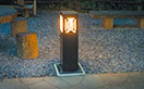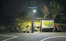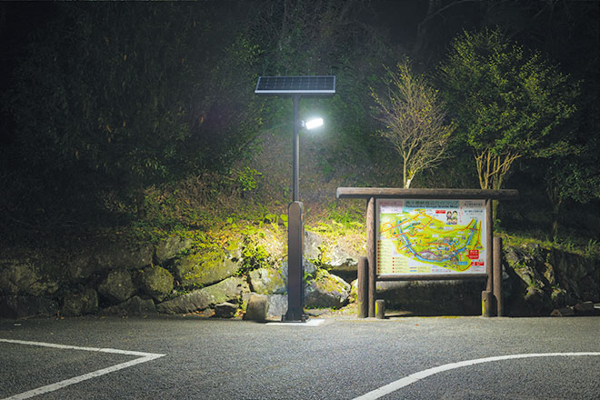 高千穂町役場では、高千穂峡周辺の照明設備を更新する工事を実施し、夜間の安全性を確保するため、遊歩道沿いの足元を照らすアプローチライト及びソーラーLEDタイルを新設しました。アプローチライトは前面に「高千穂峡の真名井の滝」と「国見ヶ丘の雲海」をモチーフにしたデザインのパネルを使用し、光源には省エネに貢献する高効率LEDランプ「レディオック LEDライトバルブG」を採用しています。また、観光客の写真スポットとなっている名勝高千穂峡の石碑を照らすあかりとして、LED投光器「レディオック フラッド ネオ」を特注のボックスに収容して設置しました。遊歩道の入口付近、またバリアフリーの「滝見台」へと続く道にある街路灯についても灯具交換を行い、LEDポールライト「レディオック エリア トリカ-エル」を採用し、漏れ光を考慮のうえ、設置場所により笠のオプションを使用しています。駐車場には防犯のため、必要照度を確保出来るようLED太陽灯を設置しました。
