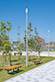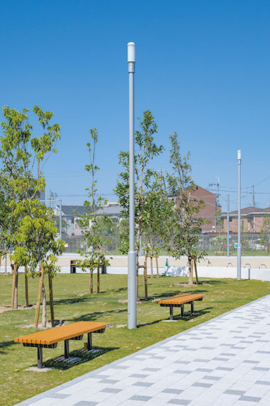 公園内の照明については、周辺環境に十分配慮した照明計画のもと、照度分布の作成を行いながら適切な照度を確保したうえで配置を検討し、園路照明にはシンプルなデザインで周辺に調和するLEDポールライト「レディオック エリア トリカ-エル」をご採用いただきました。また、防災機能を有する公園であるため、災害時には非常用電源として活躍するLED太陽灯「レディオック エリア Dタイプ」をトータルで10基、設置いただきました。