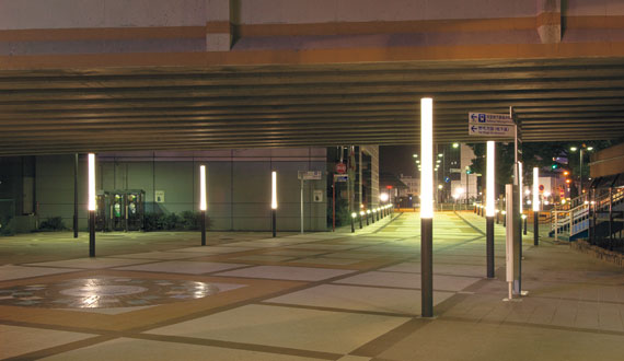 Myリストに追加桜木町駅前広場周辺の整備工事に伴い、高架下の桁下照明として設置された照明器具は、シンプル&モダンなデザインの特注パイプアークで、ポリカーボネイトカバーを通してソフトな輝きを放つセラルクス70W/4300Kの光が鉛直面照度を確保し、往来する人々をやさしく照らし出しています。