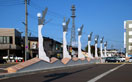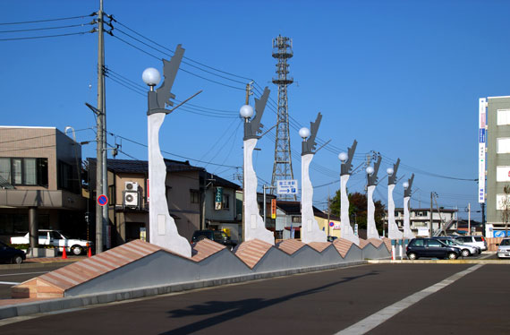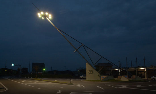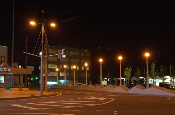 駅前広場照明用には、直江津の海岸線を形象化した照明灯を、また駅前交差点照明用として帆船をイメージした複合柱を設置。斬新なデザインの照明柱の光源には、季節に応じて光源の切り替えが出来るアイ ツインアークを使用して季節感に変化をもたせています。