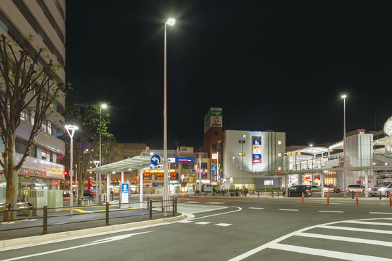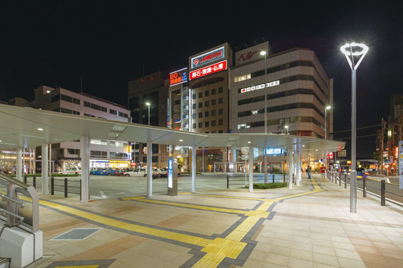 また、街路灯や照明にはLED照明が採用され、路線バス乗降時の屋根や街路灯の一部に太陽光パネルが設置されるなど、環境に配慮した空間となっています。省エネ及びランニングコストの削減に貢献するLEDの光が新しくなった駅前広場を夜間も安全・快適に照らし出し、市民の方々からも「明るく、きれいになった」と好評をいただいています。
