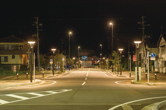 アルプス口駅前広場から続く駅前通りの歩道を照らす街路灯にはミーティスを採用いただき、セラルクス3000Kの暖かみのある光で歩道空間をやさしく照らしています。駅前広場の道路灯は省エネに貢献するLED道路灯「レディオック ロード」が設置されています。また、高架下の駐車場はシンプルなデザインのLED街路灯「レディオック エリア アリビオ」が設置され、夜間の安全性を高めています。