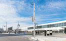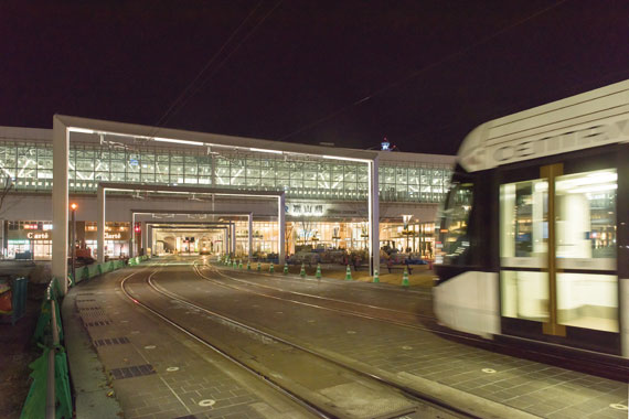 軌道空間は、光る門型架線柱が連続し、南北の軸性が強調されたデザインを特長としていて、LEDラインユニットによる間接照明を採用いただきました。また、高架下停留場の門型柱にはLEDラインユニットによる間接照明に加え、コンパクト設計のLED投光器「レディオック フラッド ニノ(スプリットカバー付)」を組込み、省エネに貢献する光で、ホームを明るく照らしています。