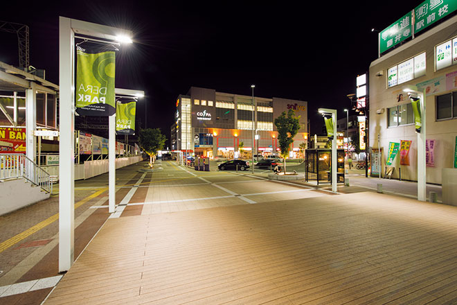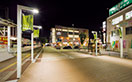工事にあたっては、藤井寺駅周辺まちづくり協議会の提案を踏まえたうえで、電線類の地中化やバリアフリー化、駅前広場の再整備などの工事を実施しました。歩道の幅を広げ、歩行空間をゆとりあるものとし、歩行者にやさしい安全で快適な道となっています。照明環境については、駅南側の歴史を重んじる雰囲気とは対照的に近代的なイメージの空間に調和するよう、LED道路灯「レディオック ロード」や駅北交流広場を照らす特注照明器具についても仕上げ色に拘り、イメージに馴染むよう留意しました。省エネを推進するLED器具の光が明るく街並みを照らしています。