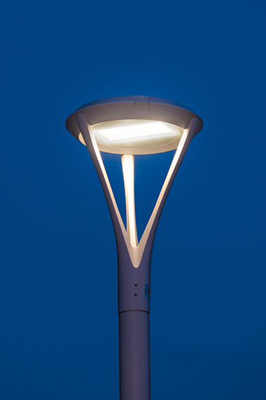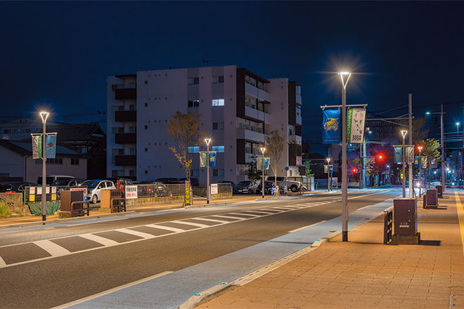 歩道を照らす照明には、周辺環境に調和するスマートな灯具デザインを特長とするLEDポールライト「レディオック エリア ラムス」をご採用いただきました。歩道空間の明るさを確保しつつ、電球色の光色で落ち着きのある優しい空間を演出しています。