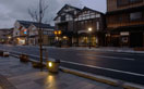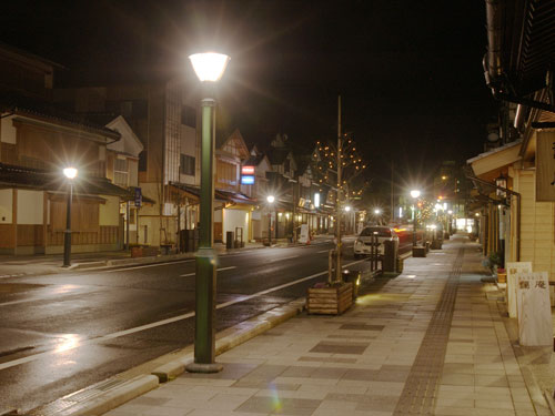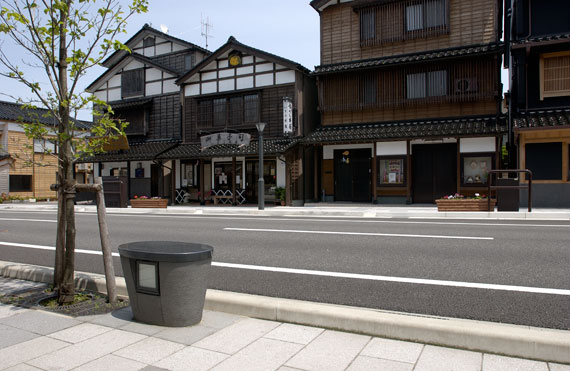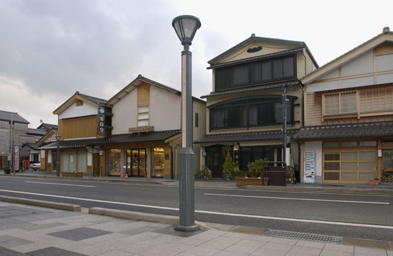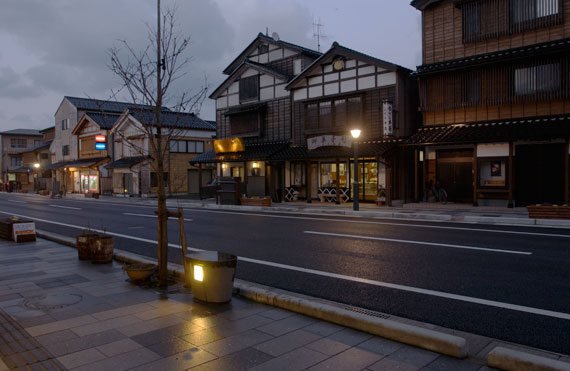 道路景観の重要な要素となる街路灯については、基本的にゆったりとした人の流れに沿うようなかたち、輪風のまちなみに調和する光のデザインを求めました。八角形断面の照明ポール上部の一面に地元材のアテ材(ムク)を組込み、アクセントとしてアワビの殻を螺鈿的にあしらっています。歩道もアワビの貝殻粒入りブロックで舗装されていて、通りを歩くと埋め込まれたアワビ貝が街路灯やフットライトの光を反射し、夜光虫のようにキラキラと輝き、輪島ならではの魅力的な道路空間を演出しています。街路灯の光源にはハイラックス3000Kを採用、必要以上に明るすぎず暖かみのある光で通りを安全に照らし出しています。