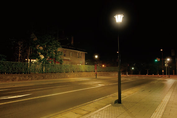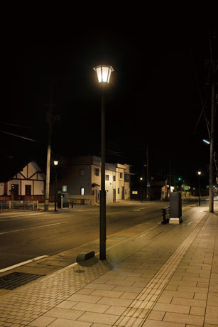 Myリストに追加弘前公園周辺の市街地環境の向上と文化資源への回遊性を高めるため、弘前公園と禅林街を結ぶ路線、3・4・5号上白銀新寺町線の道路改修事業が実施され、電線共同溝整備、歩道整備、車道舗装などの整備に伴い歩道照明灯が新設されました。ポールライトのデザインは通りの雰囲気に合わせた和風タイプで、セラルクス3200Kを光源とする温もりのある光が、ナイトウォークのあかりとして通りをやさしく照らしています。また、セラルクスは調光可能形なので人通りが減る深夜は調光することが出来、省エネに貢献しています。