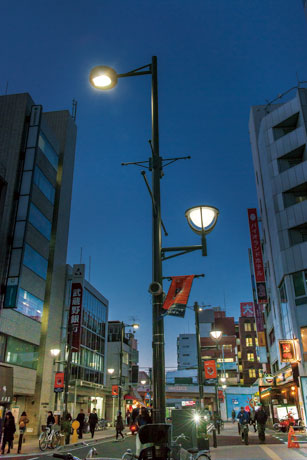 また、夏祭りの開催時を考慮して提灯をぶら下げるアームと電源コンセントを街路灯の高い位置に付けました。街路灯の施工時には、歴史のある商店街なので昔からの色々な埋設物が埋まっていて、そこに電線共同溝まで埋設したため苦労しましたが、隙間に収まるように鋼製の杭基礎を使ったり、コンクリート基礎の形を変えたりして対応しました。工事はお店の営業時間が終わった後の夜間施工でしたし、大変な点もありましたが、電線類の地中化、アーケード撤去、道路整備が行われ、すっきりとした商店街にふさわしい街路灯をジャストポイントに建柱出来、関係者の皆さまには本当に感謝しています。