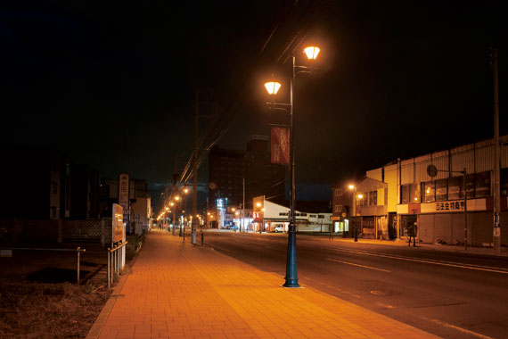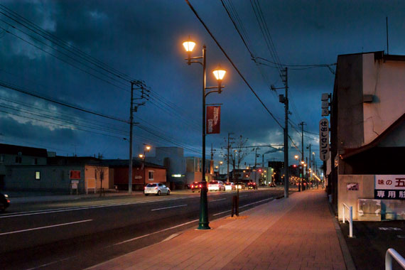 今回整備された緑町2条通の区間は、飲食店、洋品店、薬局、医院などが並ぶ昭和通り商店街を中心とした全長約810mで、地域の方々に親しまれている通りを夜間も温もりのある光でやさしく照らし出しています。歩道部は設定照度5ℓx、交差点部は10ℓxとし、適切な明るさを確保して安全の光を灯すとともに、交差点部にはさらなる省エネ推進を目的としてLED道路灯も1基設置されました。