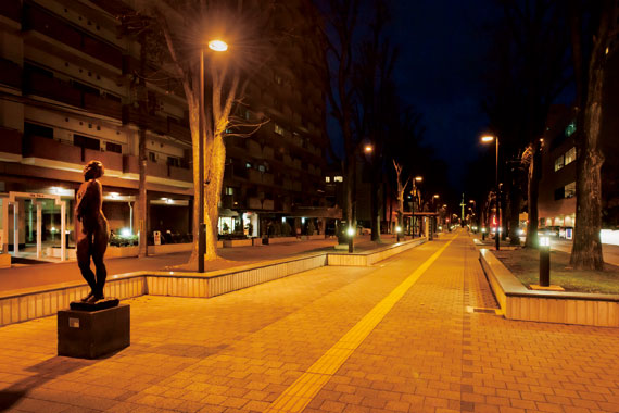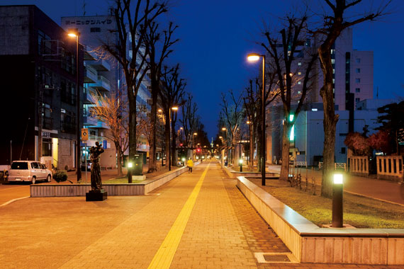 Myリストに追加旭川市の中心部にある7条公園通は、日本初の恒久的歩行者天国である平和通買物公園と、文化芸術拠点機能を持つ常磐公園を結ぶ道路で、「7条緑道」という愛称で親しまれています。緑溢れる歩行空間を道路の中心に構え、両側に設けられた数多くの野外彫刻や記念碑を鑑賞しながら、中心市街地へのアクセスができることから、「文化と芸術を感じる都会のオアシス」として市民の方々に利用されています。延長450m、幅員27mの道路は、整備後約40年が経過していることから順次施設の更新が行われていて、改修計画の一環として新たに道路照明としてパズーが、また歩行者用緑道照明としてミーティス アームタイプCが設置されました。道路照明は道路照明施設設置基準に準拠し、緑道照明は15m程度の設置間隔により、平均照度18ℓx程度、照度均斉度0.4以上を確保、明るくむらのない歩行者空間を実現しました。温もりのあるあかりがやさしく通りを照らし、夜間も安全で快適な照明環境をつくり出しています。