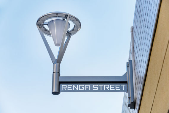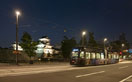 従来のクラシックタイプのデザインやLEDらしいハイテクなイメージのデザインなど数種類のデザイン案の中から、慎重に協議のうえ、シンプルでシャープなデザインのブラケットを採用しました。灯具はレディオック エリア タイプGで、リンググローブからの光が路面を明るく照らし、乳白色グローブの拡散光で明るさ感を高めています。これまでは節電の観点から深夜は全6灯中、半分位の点灯としていましたが、省エネで長寿命、消費電力の低減に貢献するLEDを光源とすることで、日の入りから日の出まで全点灯とし、夜間の安全性を高めています。