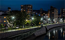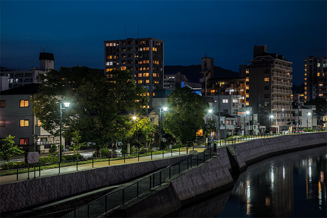 市民の憩いの場として親しまれている川岸の遊歩道をLEDのあかりで照らし、調和のとれた夜間景観を創出