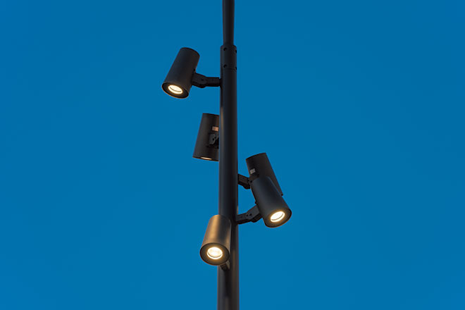 また、交差点部など信号や標識と統合できる箇所については、可能な限り統合を行うことで、景観要素の数を極力減らしていくようにしました。街路全体の統一感を演出するため、光源の色温度を電球色に揃え、ポール仕上げ塗装・色彩についても、極力共通のデザインコードを持った仕様としています。