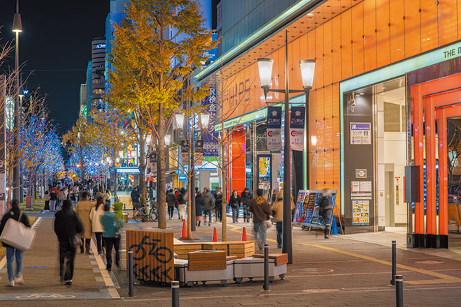大阪市では、現在進行中の「国道25号(御堂筋)道路空間再編工事」に伴い、道路照明の更新工事を実施し、既設HID(高圧ナトリウムランプ)に替えて大幅な省エネ、CO₂排出量削減を実現するLEDを光源とした歩道、車道、交差点照明を新設しました。歩道照明は、御堂筋の歴史を踏まえた2灯式のシンプルなデザインでリニューアルすることとし、ほかの工作物と調和した統一感を感じる整備としています。「にぎわいの演出」、「体験的な明るさ感」を重視し、「昼においても夜においても絵になる照明」を目指しました。車道照明は、全長12m(光源高さは10m程度)あり、都市軸としての統一感・連続性を演出するとともに、垂直性や上空への方向性を感じさせる形状とし、イチョウの樹冠を引き立てるシンプルなデザインとなっています。交差点部は投光器形の照明とし、横断歩道などの必要照度を効果的に確保しました。