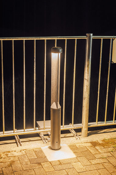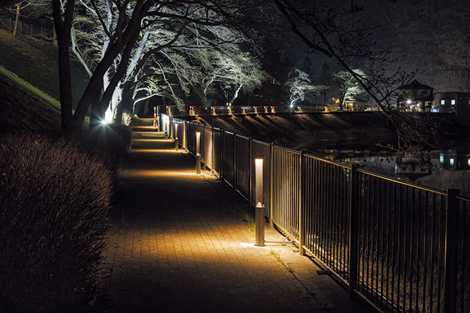 東北地方整備局 釜房ダム管理所では、2023年3月、堤体照明の一部をLED照明器具に更新するとともに、夜間における利用者の安全確保と新たな地域の観光資源づくりを目的として、ダム湖沿いの遊歩道や車両専用道路などにLED照明器具を新たに設置しました。遊歩道には、スティック形状のシンプルなデザインで足元をやさしく照らす景観街路照明「ユニス スティック ショート」をご採用いただきました。また、場所に応じてLED太陽灯「レディオック エリア Dタイプ」、LED道路灯「レディオック ロード」、LEDポールライト「レディオック エリア テンド」などを設置し、電球色で統一した暖かみのある光で空間を照らしています。桜の季節に期間限定で行われる桜並木のライトアップなどとの相乗効果で、アフターコロナを見据えたインバウンド需要にも対応できるよう整備されました。