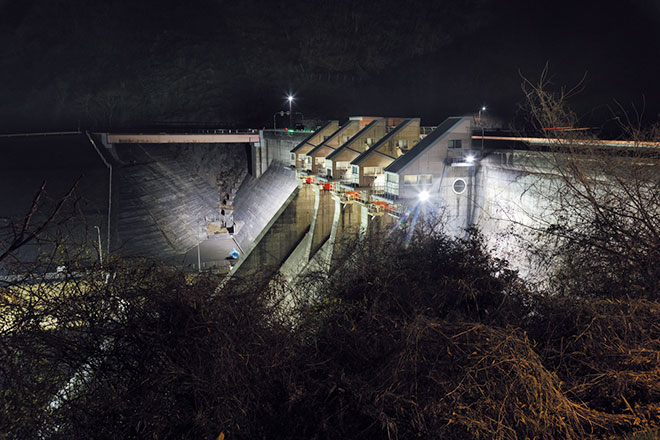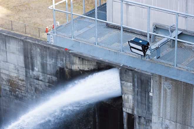 堤体を監視するLED投光器「レディオック フラッド アヴァン 250クラス」については、放流時のライトアップも兼用できるよう配光と設置場所を考慮しました。さらに照明実験で近接する県道からの見え方を検証し、まぶしさを低減するよう調整したうえで設置しています。今後、フルカラーLED投光器の設置も検討されており、県内でも有数の観光スポットになっていくことが期待されています。