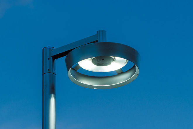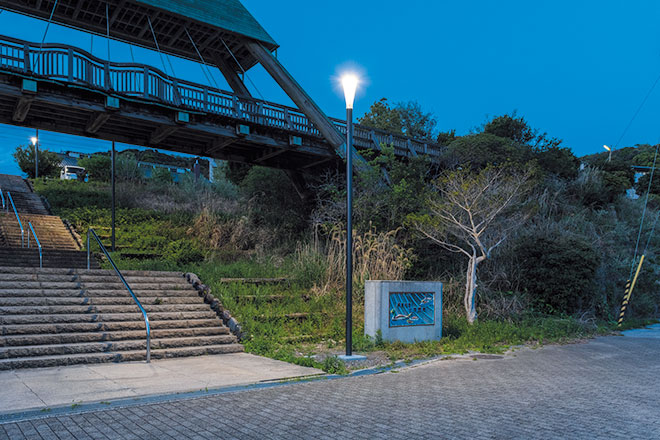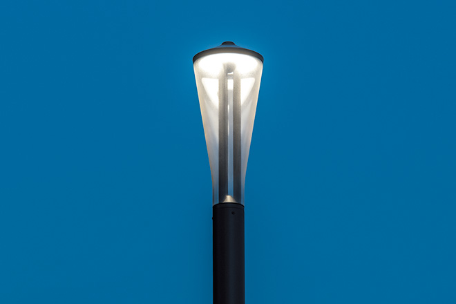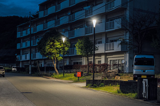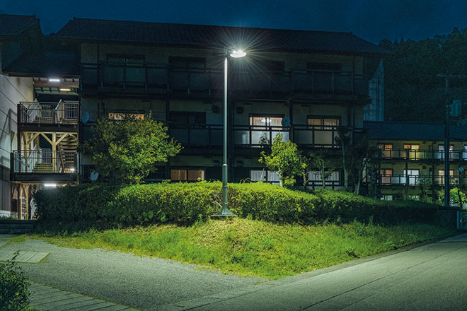 高知県では県内の20市町村に62団地を整備しており、竣工後30年以上経過している団地も多いことから、設備の改修を段階的に進めています。その一環として、2023年3月に県営住宅十市団地の街路灯をLED化する工事を実施しました。既設水銀ランプの街路灯に替えて、均一な面発光とシンプルなデザイン、上方光束を抑えた光で調和された空間を創出するLEDポールライト「ユニス フレア」に更新いただくことで、既存の照度を確保しながら大幅な省エネを実現しています。