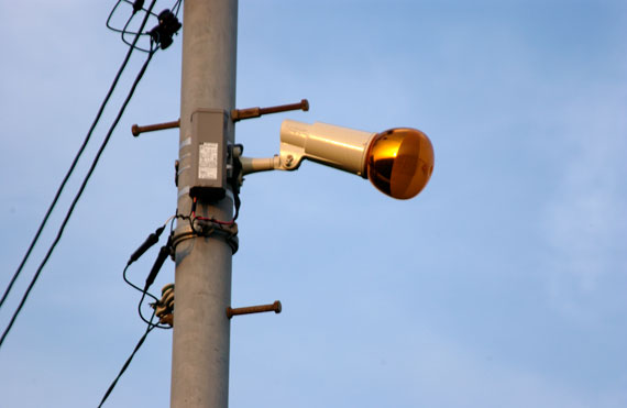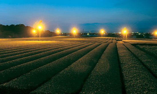 Myリストに追加長坂茶園では、自園自製にて煎茶を栽培しています。2.5haの茶園の内の1.0haの区域を対象に、2003年4月より農業用害虫防除照明のエコイエロー(黄色高圧ナトリウムランプ)を9セット設置しました。農薬に頼らない効果的な害虫防除を目的としたもので、通常は二番茶の製茶工程に入る前に2回程度農薬による防除が必要でしたが、食の安全性の追求から、農薬使用を半減するためにエコイエローによる害虫防除を試みたものです。