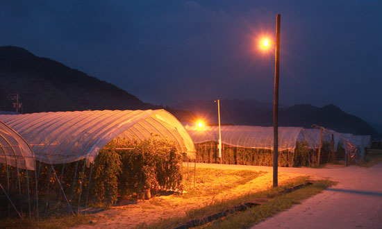 Myリストに追加“エコイエロー”は特定害虫の交尾抑制や飛来防止など光学的な害虫の行動抑制によって、害虫の侵入をシャットアウトし、防除効果を上げることができる黄色高圧ナトリウムランプです。深田農園では、エコイエロー設置により農薬散布が実をつける前の1回のみで、以降はほとんど無農薬で済むため、殺虫剤の散布回数が半分になり、安全・安心でよりおいしいトマトを出荷しています。