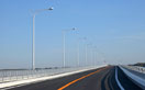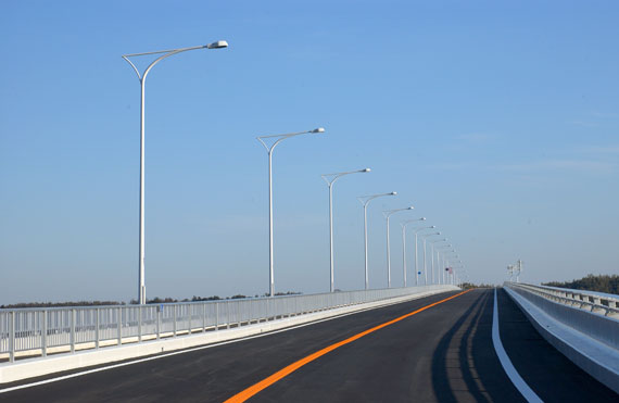 照明計画については、経済性や機能性、景観に配慮し、10mの高さのデザインポールによる照明を片道配列で約32mピッチにて設置しています。橋梁周辺の生態系への影響を考慮のうえ、照明器具には優れた配光特性を持つ道路灯パズーが採用されました。照明器具の前後方にルーバを取付けることで湖面への光漏れを抑えています。FECサンルクスエースを光源とする暖かみのある光が夜間も安全かつ快適に道路空間を照らし出します。