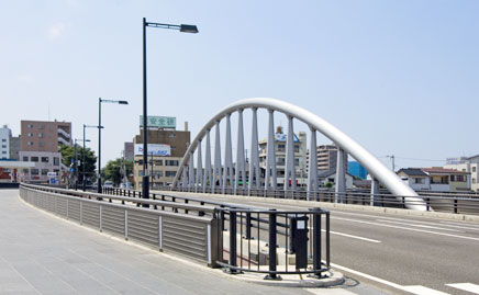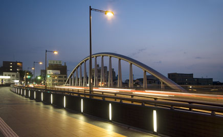 Myリストに追加石川県金沢市犀川に架かる御影大橋は、「浪漫の風ふくまちづくり」をテーマに橋の架け替えが行われました。橋としての機能だけでなく、都市景観に配慮した丸パイプの単弦アーチ橋が街の魅力を引き立てています。デザインポールは、橋梁のエレメントの一部として美しい昼の景色を創りだし、新しい街のシンボルとして親しまれています。架け替えによって車線も4車線に増え、交通渋滞の緩和が図られました。
