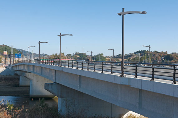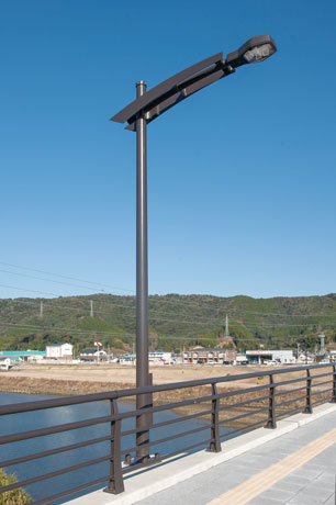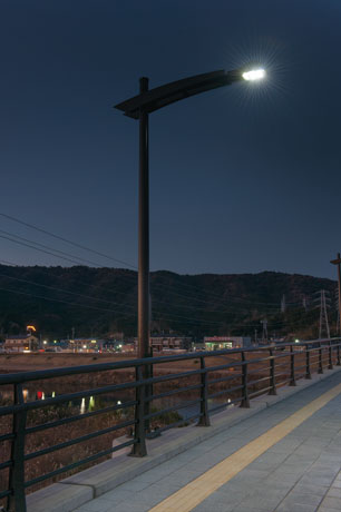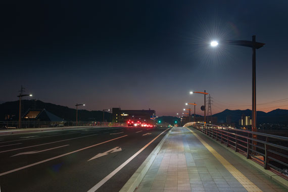 延岡市の西側を半円状に迂回する延岡西環状線のうち、五ヶ瀬川をまたぎ野地町と古川町を結ぶ五ヶ瀬大橋が2013年春、開通しました。五ヶ瀬大橋は、延岡西環状線の中心に位置する橋長190.2m、幅員23mの4径間連続少主桁橋で、延岡インター線から五ヶ瀬川を横断し、国道218号を経由して、国道10号に接続する道路交通網上、非常に重要な路線の一部となっています。橋面については、延岡への玄関口となるため、“ゲート”や延岡のシンボルとなる“川”をデザインモチーフとして計画されました。五ヶ瀬大橋のデザインコンセプトは『人々が歩き 集う 語らいの場』です。景観検討委員会により複数案から検討の結果、照明については、ゲート性を強調したアームの形状と、灯具の重量感により照明本体が強調されるデザインが選定されました。省エネに貢献するLEDの光で夜間も新しい橋梁を安全・快適に照らし出しています。