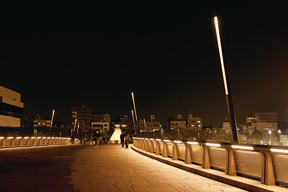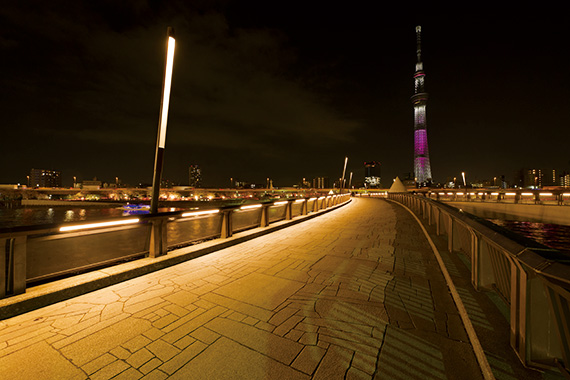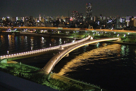隅田川唯一の歩行者専用橋を省エネに配慮したLEDの光で橋の形状をいかした魅力的な夜間景観を演出