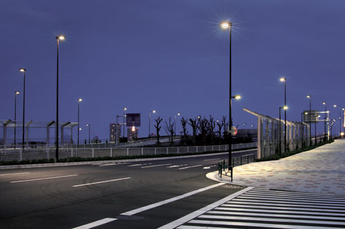 晴海通りの交差点と晴海大橋をつなぐ道路は、臨海部広域道路(晴海通り延伸部)という位置付けのもと、ゆったりとした歩道を備えた道路に整備され、照明柱も新設されました。多車線道路相互の広い交差点部に十分な照度を確保するため、交差点4隅だけではなく中央分離帯4か所にも12mの高さの照明ポールを設置し、夜間も安全に道路を照らし出しています。光源には効率のよい光を求め、効率と演色性に優れたFECセラルクスエースを選択しました。