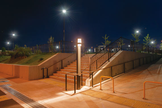 埼玉県三郷市と吉川市にまたがり、旧国鉄の貨物操車場として使われていた広大な武蔵野線操車場跡地を、(独)鉄道・運輸機構が主体となり都市基盤整備を行いました。東側の三郷市域は先に開発行為が行われ、大規模ショッピングモールや分譲住宅などが整備されています。吉川市域の土地区画整理事業の面積は約28.8haで、街路・公園整備や水道、電気、ガスなどのインフラ整備を実施。2012年3月にはJR武蔵野線吉川美南駅が開業し、新駅周辺を中心に新しいまちづくりが進んでいます。地区内の照明施設については、高圧ナトリウムランプを道路灯に使用し、明るく安全で落ち着きのある街並みを形成するとともに、公園は環境に配慮したLED照明を採用するなど、場所ごとに適切な照明器具の選定を行いました。
