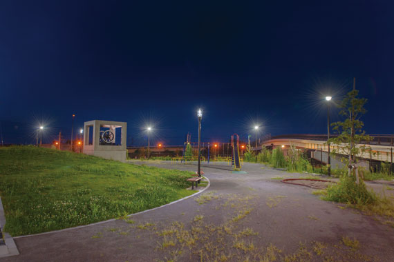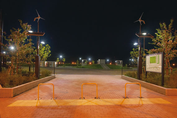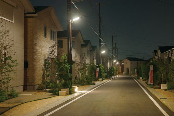 また、4号公園(仮称)にはLEDのハイブリッド灯を設置しました。自然エネルギーを電気エネルギーに変換して夜間照明に利用するハイブリッド灯は、万一の災害時・停電時に電力供給がストップした場合でも独立電源で照明が点灯し、防災ツールとしての役割を果たします。住宅エリアには防犯灯を設置して安全性を高めるなど、新しい街並みにふさわしい快適な視環境の創出を図りました。吉川美南駅周辺では、すでに大型複合開発が進行中で、今後、賑わいのある街並みが形成されていくこの地区の益々の発展を願っています。