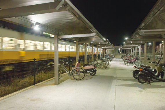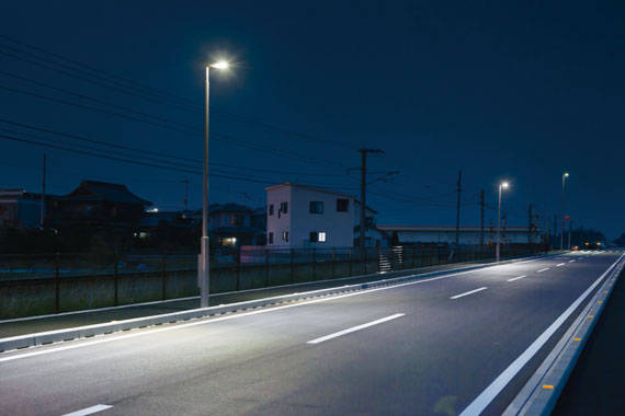 駅前の町道萱原本線交差点部は「国土交通省/LED道路・トンネル照明ガイドライン(案)」に適合するLED道路灯「レディオック ロード」を、進入道路は「レディオック ロード コパズー」を採用し、消費電力の削減を実現しつつ、JIS道路照明基準に合致する十分な明るさを確保しています。駐輪場にも「レディオック シーリング Ⅱ」を設置するなど、省エネ・省メンテナンス・環境に配慮したLEDの光で安全・快適に駅前空間を照らし出しています。