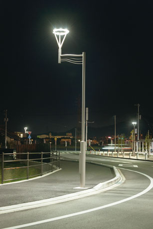 新駅を拠点とした新しいまちづくりが進む地区の駅周辺を省エネに貢献するLEDのあかりで快適に照らし出す