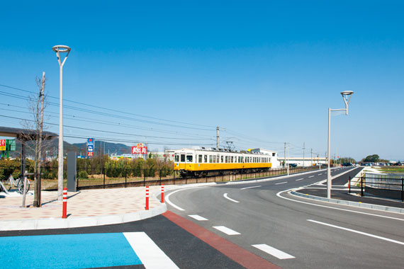 Myリストに追加香川県の高松築港駅と琴電琴平駅を結ぶ高松琴平電気鉄道(ことでん)の新駅、綾川駅が2013年12月開業しました。駅周辺には大型商業施設や公共施設があり、新駅を中心とした魅力的なまちづくりが進められています。綾川駅の開業に伴い、駅前広場や駐車場、ロータリー及び進入道路、交差点の整備が実施され、照明器具の光源については、省エネに貢献するLED照明を採用しました。駅前ロータリー部にはLEDポールライト「レディオック エリア タイプD」を設置し、広場側は直線・六角テーパーポールトップ型、歩道側はアーム型として、アームの下に讃岐うどん発祥地としてのうどんや、地元を流れる綾川をイメージした衣装飾りを付けました。