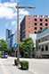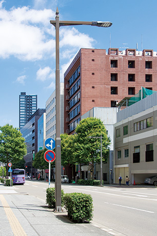 この通りには1988年頃から車歩道型2灯用照明柱が約40基設置されていて、今回、道路照明施設をLEDに更新するにあたり、LED道路灯「レディオック ロード」をご採用いただきました。デザインポールは既設を流用しており、先端部に特注のアダプターを施工することで、これまでの角型から丸型へと変換し、趣のある和風照明柱の景観を守りつつ、器具交換のみでLED化しました。