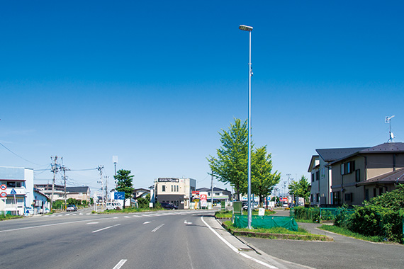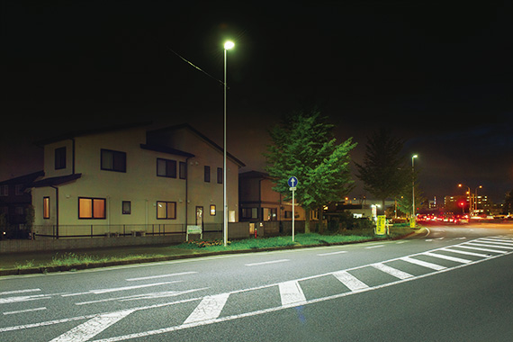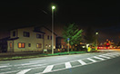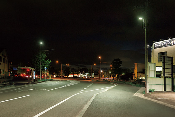 照明柱が建てられない場所は一部特注の電柱共架アームで対応し、合計3台のLED道路灯「レディオック ロード」をご採用いただき、照度アップと省エネ推進を両立させました。車道側へ光を集中することで高照明率化を実現し、均斉度の高い良好な照明環境を創出することが出来、設置後は「以前よりも明るくなった」とご好評をいただいています。