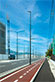 広島市では、整備の一環として、計画区域にアクセスする基幹道路であり、既存施設のショッピングモールやマリーナなどを利用する方々の主要な道路となっている一般県道南観音観音線の道路改良工事を実施しました。今回、整備を行った区間は延長約800mで、片側1車線の2車線道路と歩道で構成されていた路線を片側2車線の4車線道路へ拡幅するとともに、クランク部分を緩やかな曲線に改善し、歩道に加えて新たに自転車道を整備して交通の利便性及び安全性を向上させました。車道、自転車道、歩道を照らす道路照明については、全体の明るさを確保するため、高さ12mのアーム取付形LED道路灯「レディオック ロード」を設置して、設定基準を満たす照度と均斉度を満足する設計としました。連続照明を中央分離帯に設置することにより、歩道側に柱を設置する必要がなくなり、すっきりとした景観になっています。また、上下線で1本の柱としたことで本数を減らすことができ、配線ルートもコンパクトにまとめることができました。