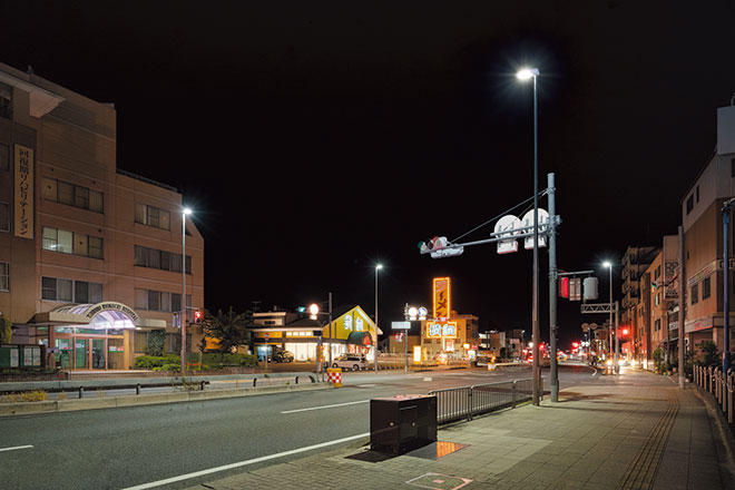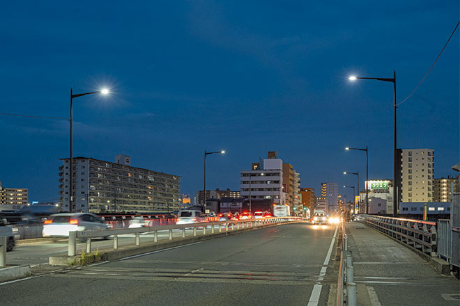 その一環として行われた今回の道路照明LED化については、既設HID道路灯に替えてLED道路灯「レディオック ロード」をご採用いただきました。防じん・防水性能を向上し、高効率、高出力、長寿命を特長とする光で大阪府内の幹線道路を照らし、省エネ推進に貢献しつつ、夜間も安全で快適な照明環境を創出しています。