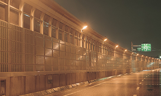本道路照明については、近隣にマンションなど住宅地が控えていることを考慮し、特に漏れ光に留意しました。亀岡方面へと抜ける出入口、及び川西市へと抜ける出入口部分の照明は、従来のポール形照明器具を遮音壁に直接取付ける箱形照明器具に変更することにより、周辺環境への光の漏れを極力抑えるようにしました。