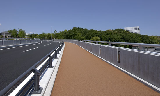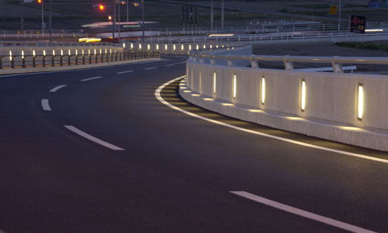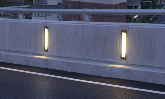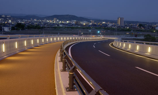 Myリストに追加橋長105.2m、車道幅員7.75m、歩道幅員3.0mの大きなS字カーブを描き、中部大学への道路橋として整備が進められた松本跨道橋は、周辺景観を損なわないように「シンプル & スレンダー」をコンセプトにデザインされました。コンセプトに基づき、器具や光源にも光害・環境・景観対策として、架橋部分にはポールタイプの照明柱を使用せずに高欄に組込形の照明器具を設置しました。十分な路面照度を確保しつつ、良好な視線誘導の役割を果たします。