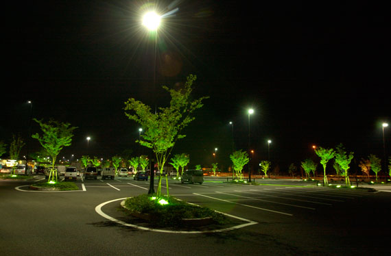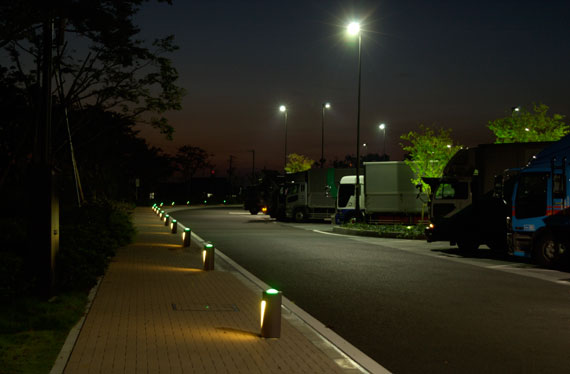 基本的な明るさを得るためのポール照明など、機能的に必要とされる照明器具には、上方への光漏れがなく、周辺環境に配慮したものとして、パズーが採用されました。