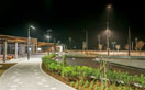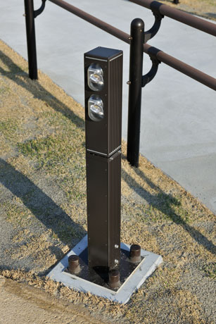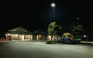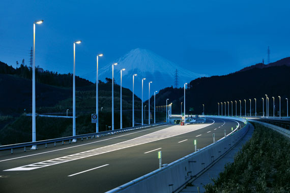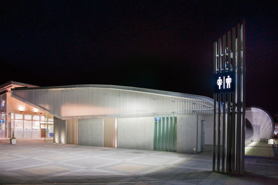 NEOPASA清水は、上り線、下り線共用の商業施設です。「くるまライフ・コミュニティパーク」をテーマに、ガレージをモチーフにした個性的な外観デザインで、車・バイクを楽しむ人々の賑わいの場を演出しています。屋外照明については、建物の建築的なこだわりを照明にも反映させ、全体の景観の一部として照明器具をきちんと見せることを前提にしたデザイン及び配灯を行いました。照明ポールは本線から休憩施設の場所をお客さまに明示するシンボル的な役割をもたせ、夜だけでなく昼間の見え方にも留意したデザインとしました。また、建物壁面をLED投光器で効果的に照らし出し、鉛直面照度を確保してお客さまの視線に合わせた照明環境を創出。エリア内を照らしている2灯用LED照明ポールは角テーパーポール2本を向かい合わせに配して、見る角度によって光と影の影響により表情に変化をもたせさまざまな見え方ができるよう配慮するなどデザイン性も重視し、安全・快適な屋外視環境の創出を図りました。