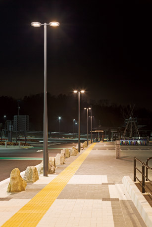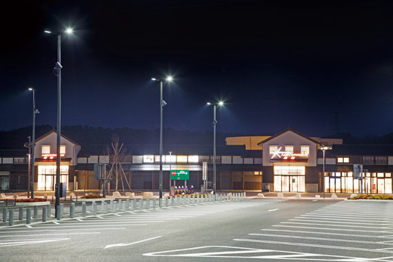 また、下り線は、織田信長本陣跡地に接しており、古戦場をのぞむことができます。駐車場照明や歩道照明については、景観に十分配慮し、照明ポールの乱立を避けカメラや拡声放送スピーカーと共架するとともに、エリアの雰囲気に合わせポール色をフェニックスカラーとし、景観に溶け込むようにしています。また、照明器具は全てLED照明とし、省エネに貢献する環境に配慮した照明環境を創出しました。