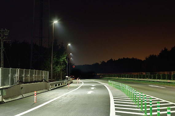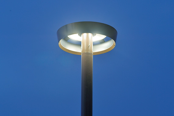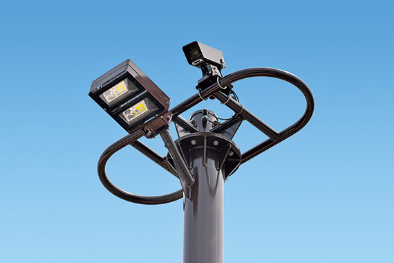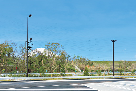 駒門PAは富士山の裾野に位置し、晴れた日には雄大な富士の姿をのぞむことが出来ることから、「レディオック エリア アリビオ」のポール高さを5mとし、富士山の眺望を確保しています。また、照明ポールの乱立を避けるためにカメラや拡声放送スピーカーを共架させ、塗装色も場所性を考慮のうえ、ダークブラウンとするなど環境との調和を重視した照明プランとしました。