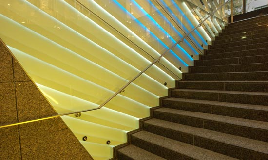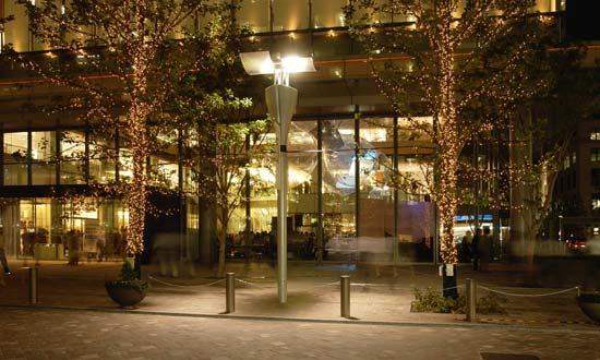 Myリストに追加丸の内ビルディングを囲むオレンジ色のラインは8mと31m地点の2箇所に設置、光源にはLEDが用いられ、周辺景観との高さを合わせることで調和するスカイラインを表現しています。周辺のストリートには、オブジェとしてデザインされた外灯で明るく路面を照らしています。また、ビルのトップ部分には蛍光灯の無段階調光によるパターン照明を行っています。